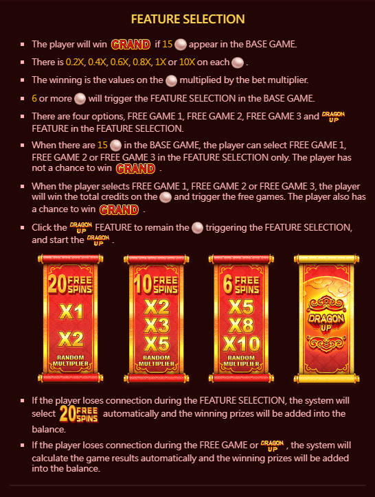 Dragon Up ฟีเจอร์สุ่มพลัง เป็นโหมดสุ่มขั้นสูง ล็อก Pearl เพื่อสุ่มตัวคูณ 50–500% และลุ้นเพิ่มสปิน สามารถรวมกันจนรับรางวัล Grand หากคลุมวงล้อตามเงื่อนไข