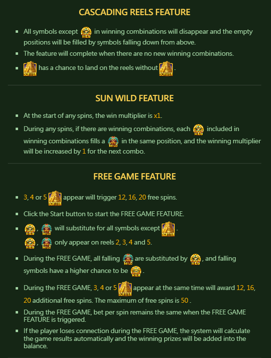 - Sun Wild Feature – Wild คูณรางวัลสะสม ทุกครั้งที่ Wild อยู่ในชุดชนะ จะเปิดใช้ตัวคูณแบบสะสม โดยเริ่มต้นที่ x1 และเพิ่มขึ้นเรื่อย ๆ ทุกคอมโบใหม่ในรอบนั้น ยิ่งแตกติดกันยาว ยิ่งได้เงินก้อนโต